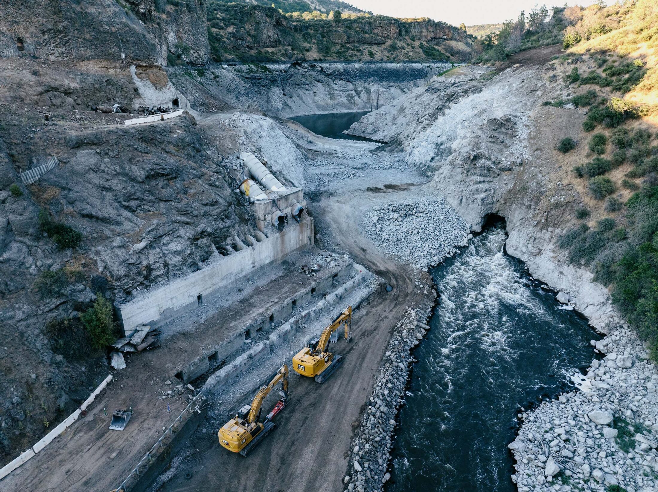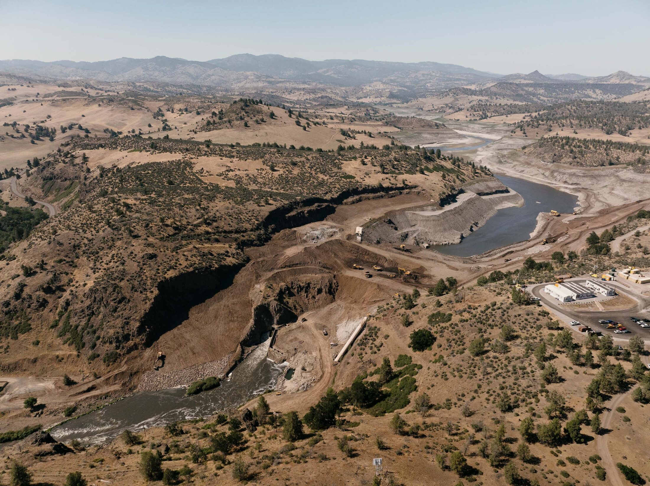 One morning, I went to observe the destruction with Ren Brownell, public information officer with the Klamath River Renewal Corporation, the nonprofit tasked with removing the dams. We climbed to a bluff overlooking Iron Gate Dam, the structure furthest downriver, end of the line for salmon since 1962. The scale of the operation below us confounded my mind. A colossal crater, wide as two city blocks, yawned where the pyramidal dam once stood. Construction equipment, yellow and tiny as rubber ducks, scraped at the dam’s foundation. Because Iron Gate had been a simple earthen dam, Brownell explained, the process of dismantling it was straightforward: the Renewal Corporation was returning the dirt, a million cubic yards of it, from whence it came. We watched bulldozers shove the earth into piles, which were scooped up by excavators and deposited into dump trucks, which rolled in caravans to the quarry where it had been extracted in the first place. It reminded me of watching a film played in reverse.