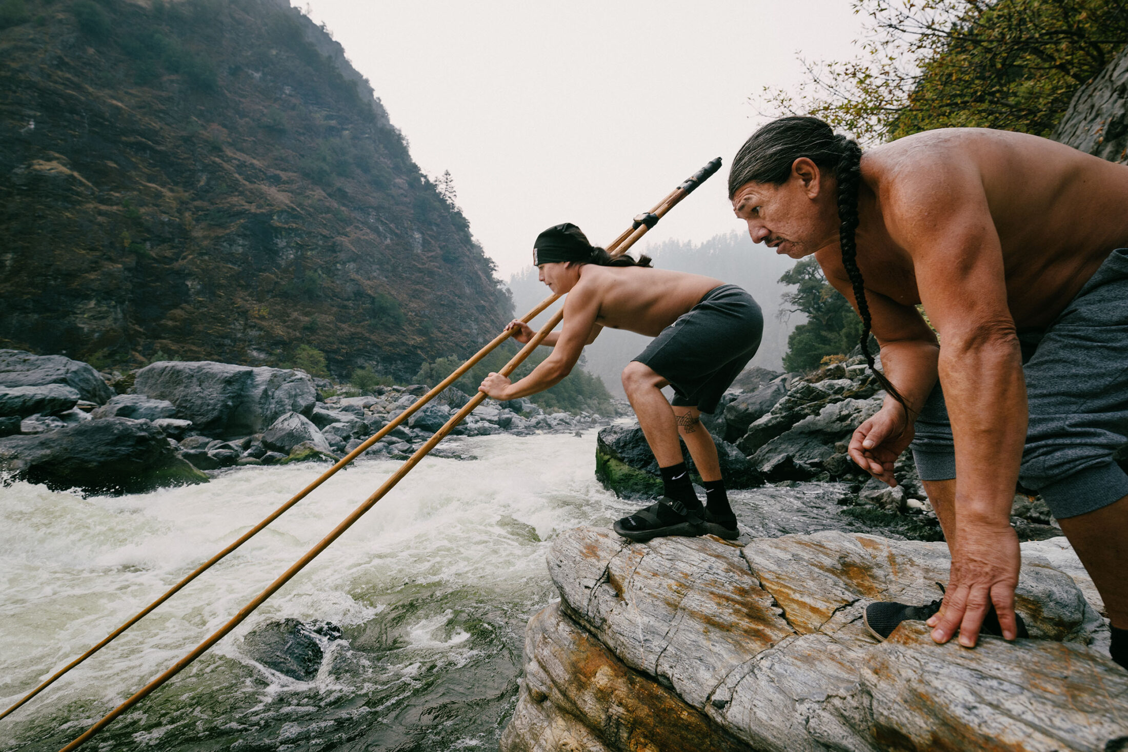 We entered the stretch of river that Reed called the “fishery,” a jumble of truck-sized boulders, etched by water, that loomed precariously over tumultuous whitecaps. “This is my world. This is my sanctuary,” said Reed, tranquil amidst hydrologic chaos. Between immense rocks, the river gentled into pools, eddies, and side channels where migrating salmon pause to marshal their strength. Reed and other Tribal fishermen ply these pockets with dip nets traditionally made of fir poles and iris fibers, swinging the nets through slow water to corral lingering Chinook. Reed kills his fish with a club and smokes them, barbecues them, or pierces the steaks with redwood sticks and roasts them over open flame. “I’ll be catching the first fish here, and probably the last fish,” Reed said.
