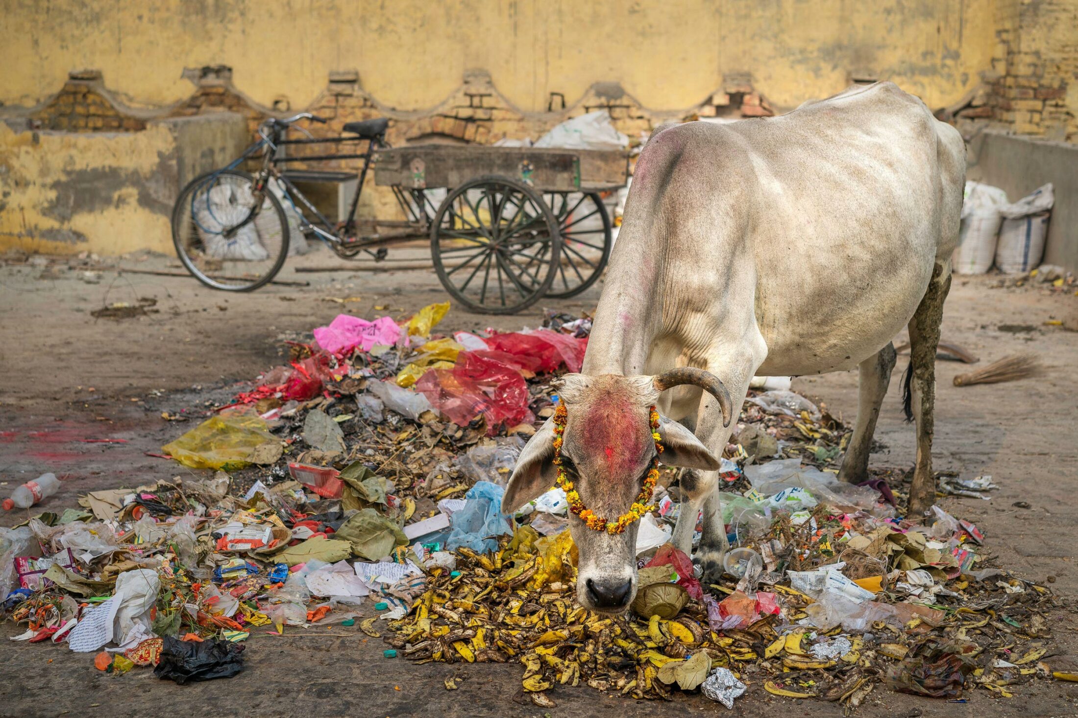 “The cow is a poem of pity,” Gandhi continues in his essay. Most of the associations with cows eating trash are really cows consuming plastic. Indian cows do consume so much plastic it’s almost unthinkable—various newspaper articles, YouTube videos, and What’s App forwards chronicle the removal of 18 kg of plastic waste from a cow’s rumen, 27 kg of plastic, an impossible-sounding 52 kg. “It is normal to remove plastic from cows,” one doctor reported to the interviewer, “this is not new.” Cows—often stray cows—pick at unsegregated roadside waste in an attempt to get at leftover food inside plastic bags and foil wrappers. Indeed, this seems to be the full-time pastime of the stray cows that drift around the recycling center on the Mumbai-Pune highway access road. Their soft lips mouth across yellow plastic carry bags, blue plastic carry bags, pink carry bags meant to resemble fabric but which are, again, ultimately plastic. One study even explored whether cows are singularly attracted to the smell of decomposing plastic compounds, because cows consume so much plastic. I suspect, although this is wholly unscientific, that they are just hungry.