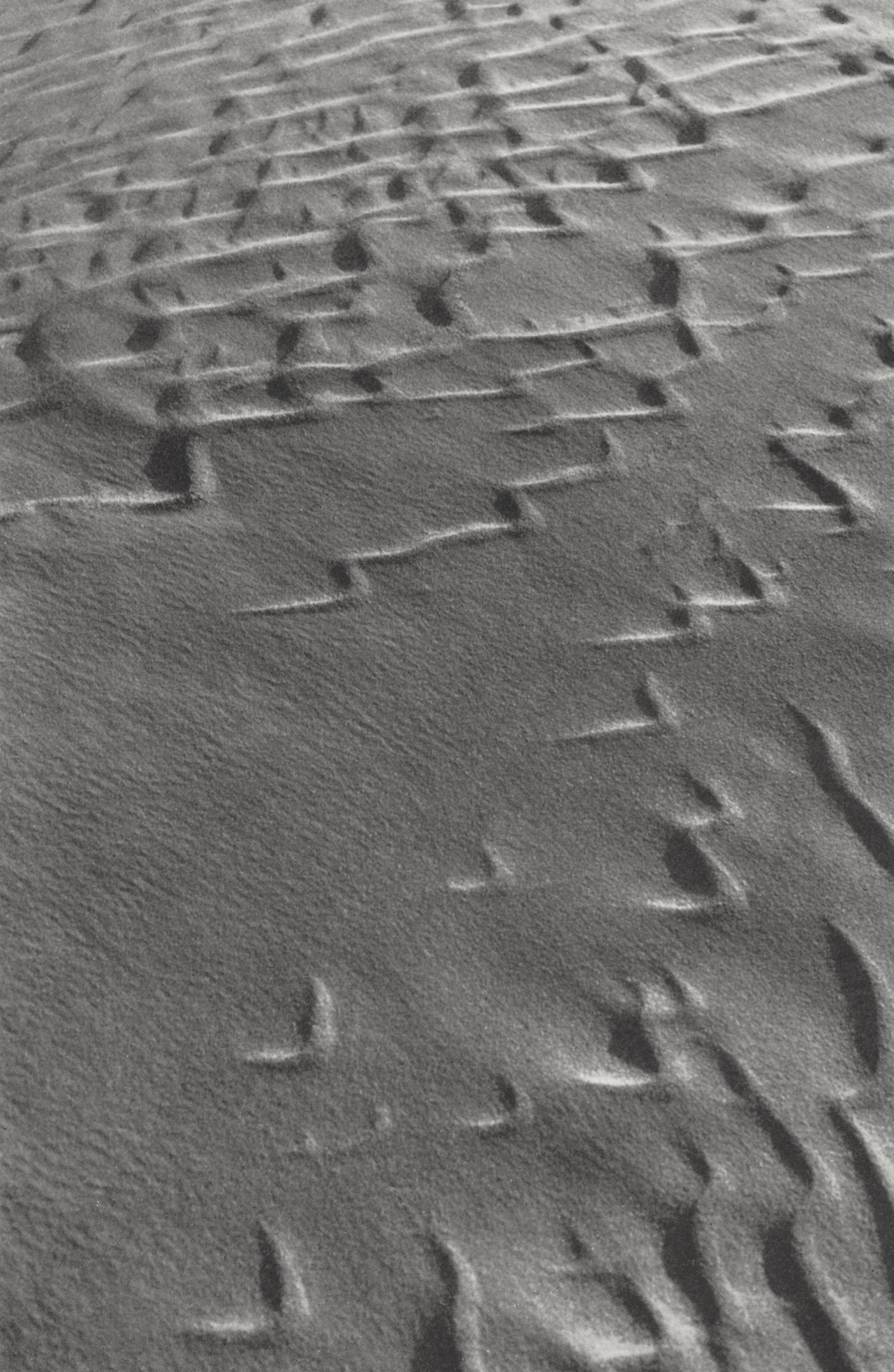 Now human footprints on the sand have been replaced by animal ones. This dunescape, by turns Dead and Grey, represents both death and life. But “Dead” has another meaning too—one that refers to the dunes themselves. Because these dunes, unlike the giant Parnidis, have stopped moving.