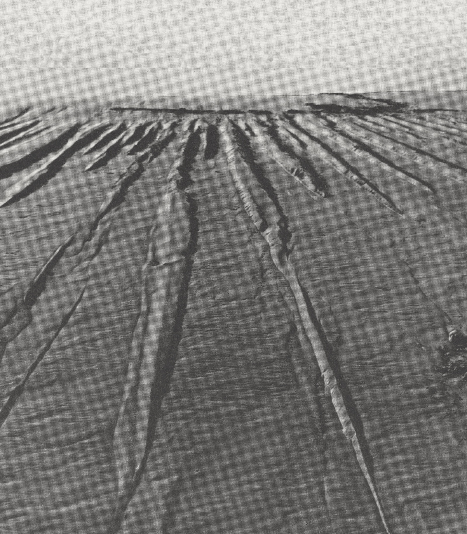 The ridge was built on the stoss side of the Curonian Spit, facing the westerly wind and the Baltic Sea. Eventually sixty miles long, it was completed over a century, an intergenerational project handed from parents to their children (the first part was finished in 1829 by Björn’s son). Meanwhile, wide-scale reforestation was underway inland. This required leveling the surface of the dunes before the erection of “sand traps,” barriers of pine branches fixed in place with upright stakes, positioned laterally to the direction of the prevailing flow. After these barriers were engulfed, dikes were built on top of them and higher sand traps raised. These defensive fortifications spread for many miles. The stabilized area was then fertilized with horse manure, sown with seedlings, and covered with brushwood to protect it from the wind. The highest dunes were planted accidentally with mountain pine—after a mix-up with the fir seeds that had originally been requested—but the pines proved viable. Their roots crept deep into the sand. Gradually its movement stopped. The dunes began to die.