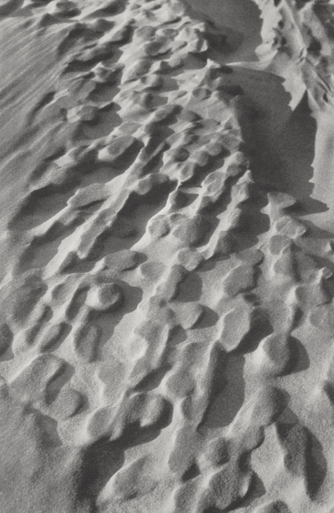 A photograph from 1902 shows this process underway: a wooden house with a reed-thatched roof and a carved gable decoration—a tradition dating back to pagan times, to bring protection and good luck—buried nearly up to its eaves in pillowy white sand. Two men in hats, hands in their pockets, gaze at the camera with the doomed melancholy of everyone in early twentieth-century photographs. Behind them is the sea, and in front, more sand. The effect of the composition is to emphasize their entrapment, caught between a sea of water on one side and a sea of sand on the other, their house made uninhabitable. Only a line of sunken footprints hints at an escape.