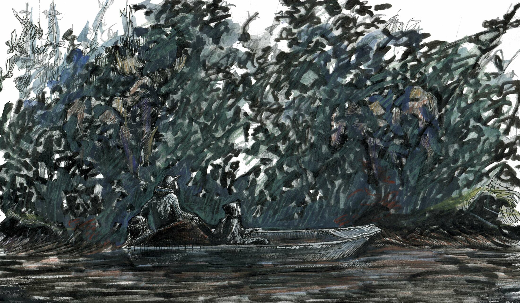 But stories of gorging heroes have failed, and at scale. That failure is visible in the erosion along the river. Stanley asks me to photograph it, slowing the boat as we pass the inchoate places. Kneeling in the boat, the slumping land in my viewfinder is clearly neither at its beginning nor an end. We, you, are in the midst, in the current. Not everything will resolve in the brief years we have alive, together. But there is time to listen for stories that are not lethal. To see a new pattern in time.