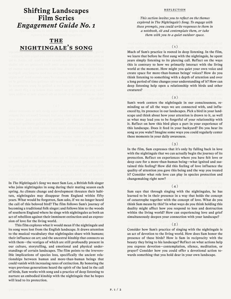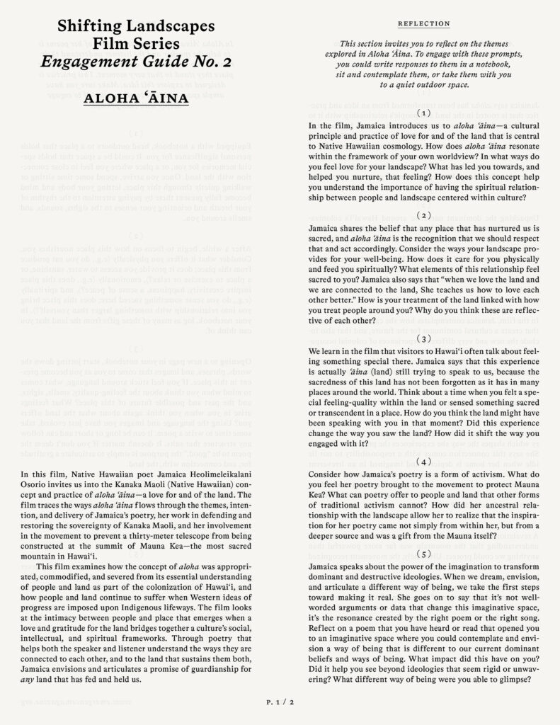 This Engagement Guide is a companion to our four-part Shifting Landscapes documentary film series, which explores the power of art and story to orient us amid the darkness of our time. Following a musician, a poet, a writer, and a filmmaker who are each embracing the alchemical power of story to connect and transform us, this series opens ways of being that hold both catastrophe and love as our landscapes change and disappear. Responding to great changes within their landscapes—the vanishing song of the nightingale in southern England, the desecration of a sacred mountain in Hawai‘i, a melting glacier in Iceland, and a traditional way of life threatened by development in Cambodia—they create art that can help us understand the changes beginning to affect the places we call home; and offer stories that open us to our connection with the Earth. In four corresponding guides, we invite you to explore the pathways illuminated by these storytellers and a depth of relationship with your own shifting landscape. Through spaces of reflection, discussion, and practice, each guide offers ways to weave these stories with your own; to open a dialogue and share values within your community; and to cultivate a living connection with your landscape.