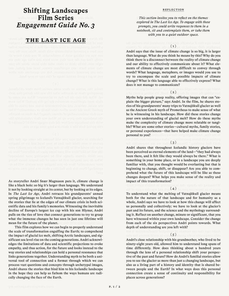 Myths help people grasp reality, offering images that can “explain the bigger picture,” says Andri. In the film, he shares stories of his grandparents’ many trips to Vatnajökull glacier as well as the Ancient Greek myth of Prometheus to make sense of what he is witnessing in his landscape. How did these stories change your own understanding of glacial melt? How do these myths make the complexity of climate change more relatable or tangible? What are some other stories—cultural myths, family stories, or personal experiences—that have helped make climate change personal to you?