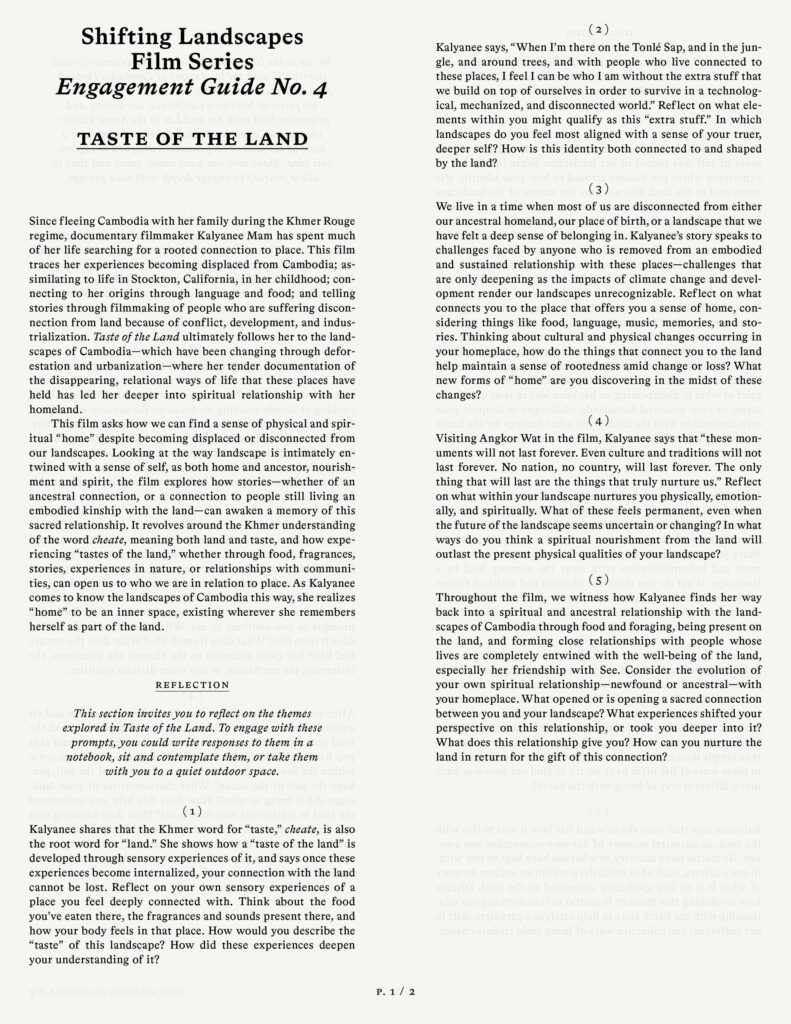 Throughout the film, we witness how Kalyanee finds her way back into a spiritual and ancestral relationship with the landscapes of Cambodia through food and foraging, being present on the land, and forming close relationships with people whose lives are completely entwined with the well-being of the land, especially her friendship with See. Consider the evolution of your own spiritual relationship—newfound or ancestral—with your homeplace. What opened or is opening a sacred connection between you and your landscape? What experiences shifted your perspective on this relationship, or took you deeper into it? What does this relationship give you? How can you nurture the land in return for the gift of this connection?